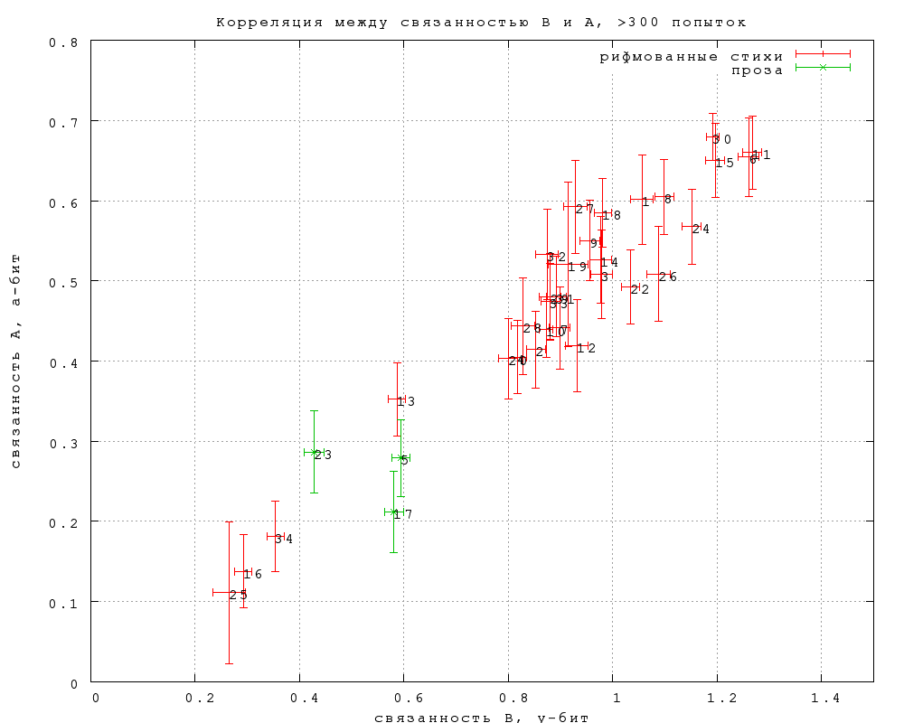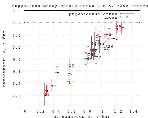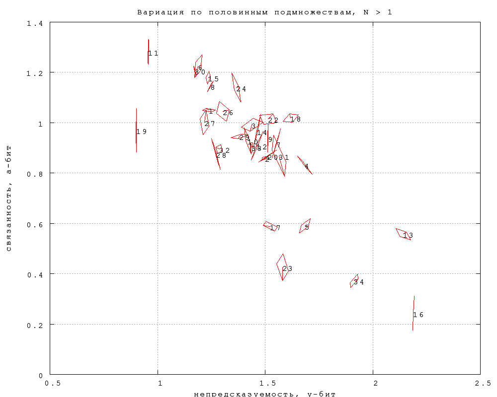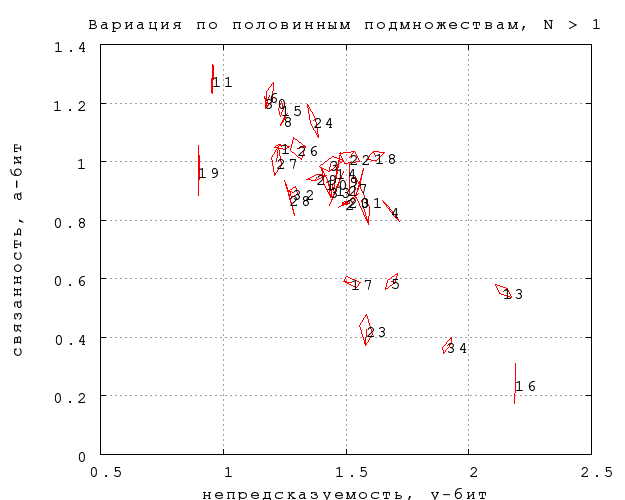 Для оценки статистической погрешности измерения ниже сравниваются результаты (непредсказуемость и связанность B), вычисленные по всем попыткам, с результатми, вычисленными только по половине попыток -- по четным, по нечетным, по попыткам, номер которых < 2 mod 4 или > 1 mod 4. В результате каждая категория текстов представлена на графике центральной точкой и описанным вокруг нее четырехугольником, вершины которого соответствуют результатам по четырем половинным подмножествам. Размер четырехугольника ориентировочно соответствует погрешности измерения центральной точки (а вернее, приблизительно в полтора раза превышает ее). Черные числа -- номера категорий. Категории 5, 17 и 23 -- прозаические, 13, 16 и 34 -- Введенский, Хлебников и Хармс (не обязательно в этом порядке), 19 -- тосты и поздравления, 11 -- Доризо, 6 -- Шекспир/Маршак, 18 -- стихи Пастернака.Фиг. 1