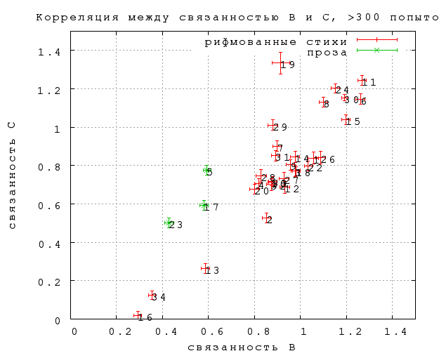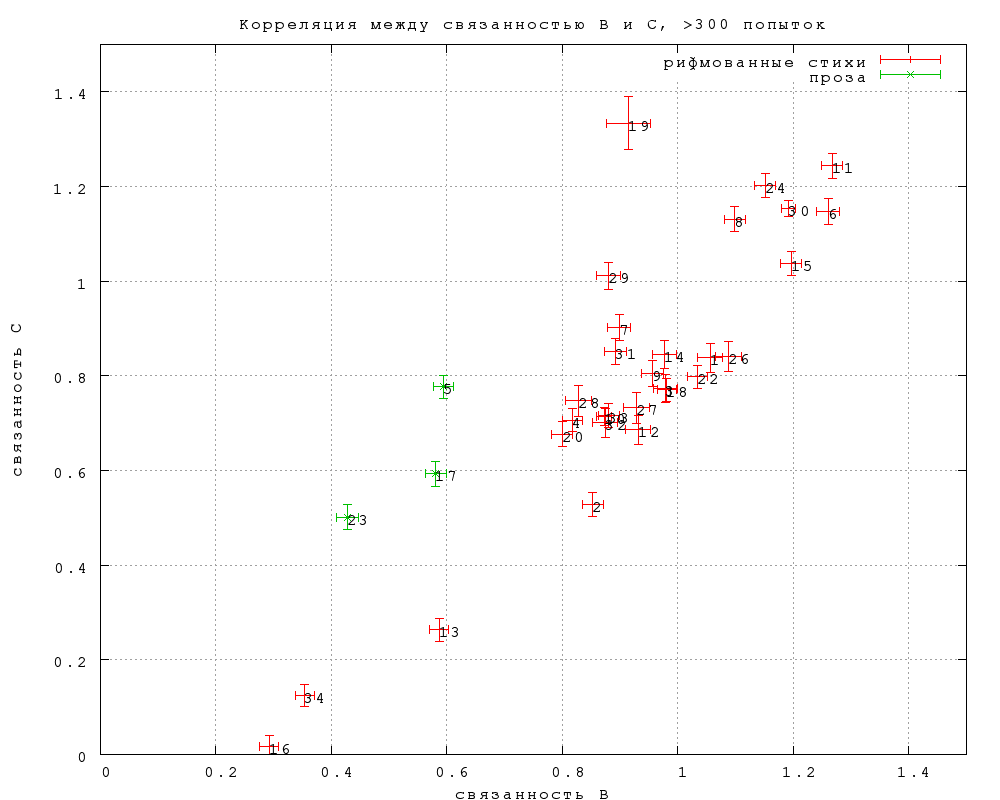 Связанность C, которая отличается тем, что в ее определении минимизировано влияние качества замен, неожиданно оказалась в среднем равна связанности B. Однако разброс превышает статистическую погрешность, и отклонения от равенства (не все, но многие) могут быть статистически значимы. В первом приближении можно считать, что связанность C значимо ниже связанности B (значимо выше она не бывает) у тех текстов, в которых в среднем труднее придумать убедительную замену.