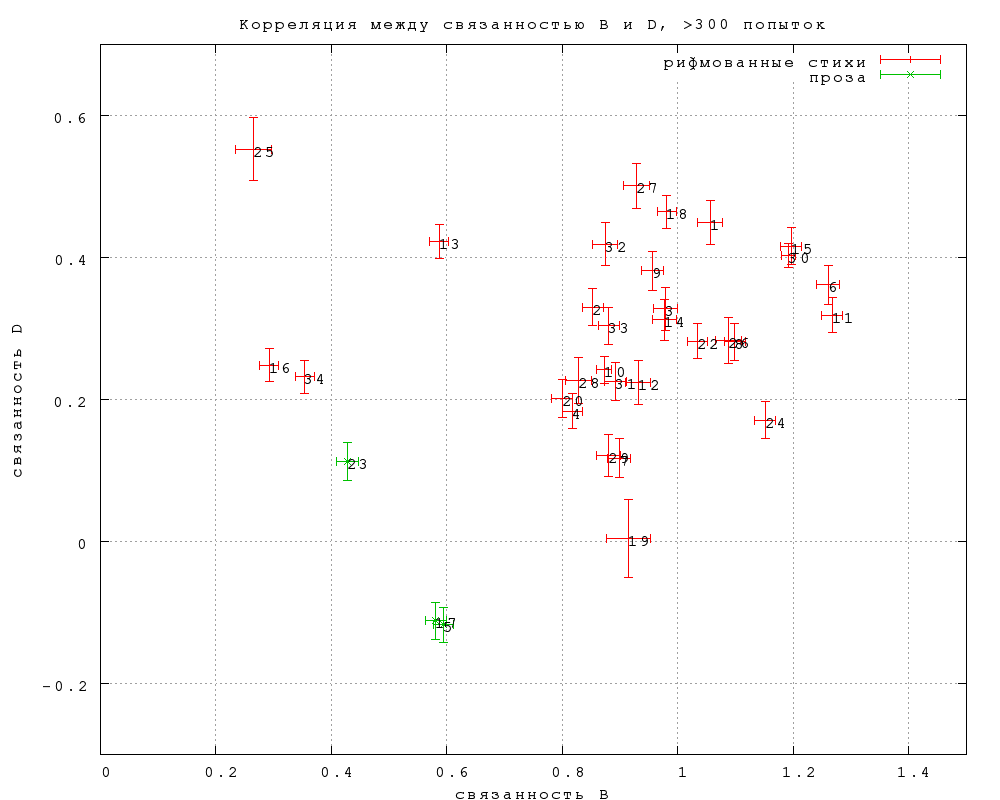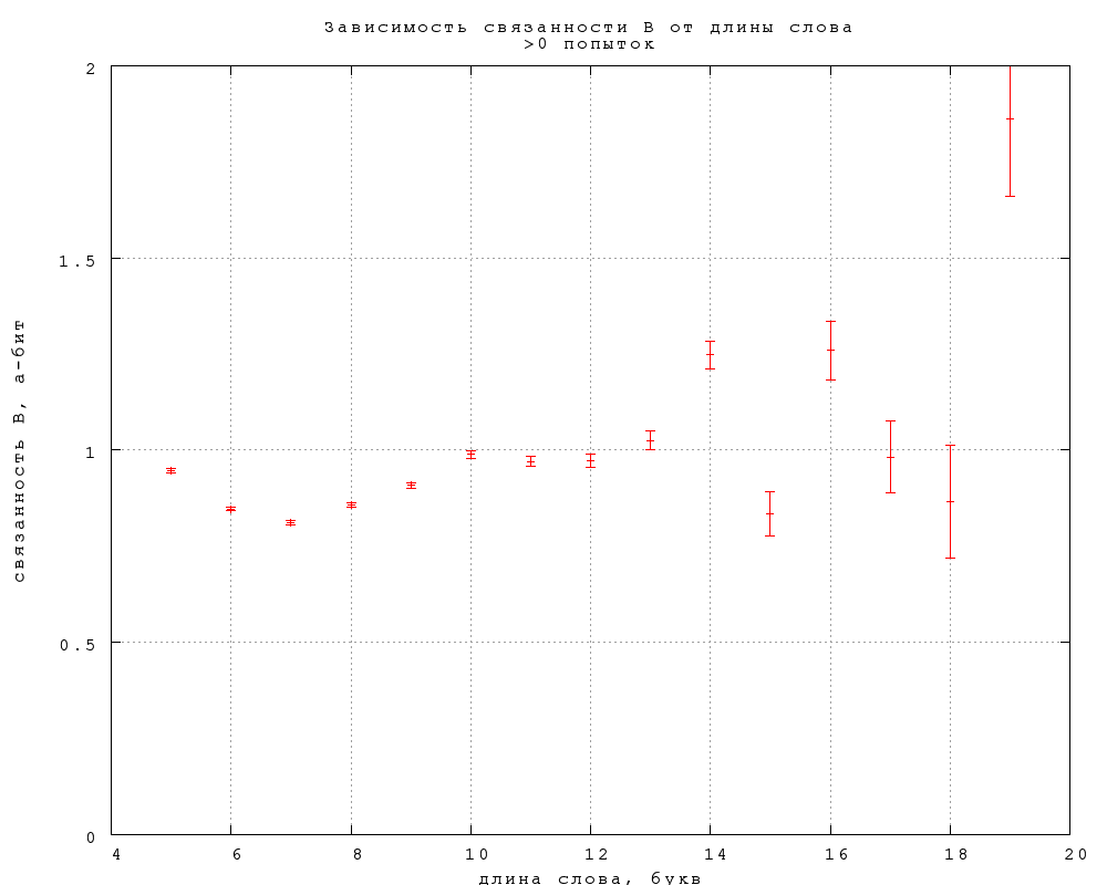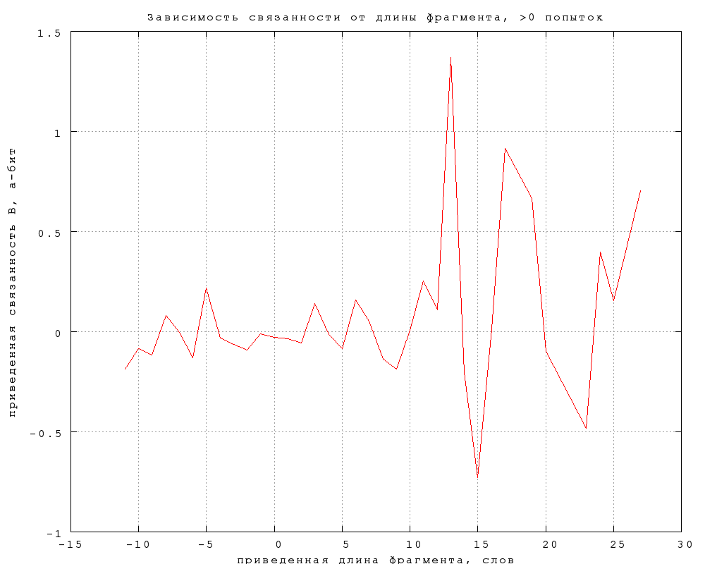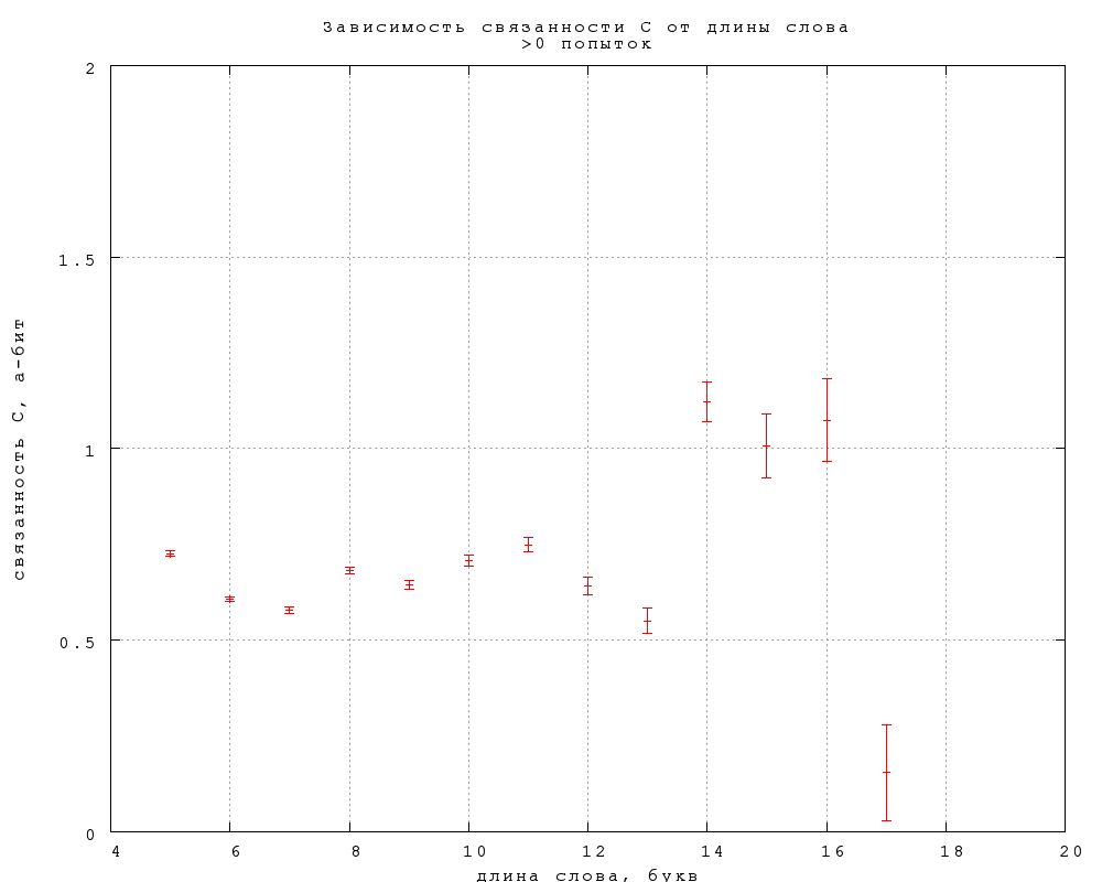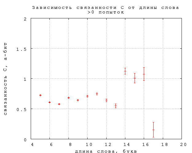 Связанность A оказывается в пределах статистической погрешности ровно половиной связанности B (обратите внимание на разный масштаб по осям на фиг. 6). Это довольно неожиданный результат, поскольку связанность -- величина логарифмическая от вероятности, и если бы вероятности находились в пропорциональной зависимости, их логарифмы отличались бы на константу. Объяснение находится, если рассмотреть еще одну разновидность связанности (D), определив ее так же, как C, но по попыткам с предъявлением замен, а не авторских слов -- см. фиг. 7 ниже.