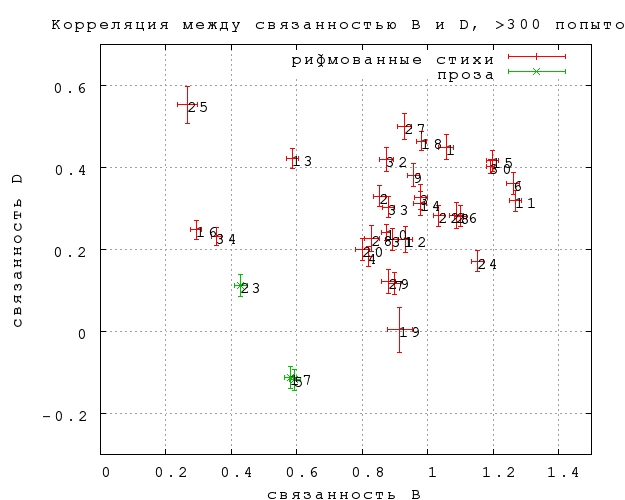 Связанность D оказывается некоррелированной с остальными разновидностями. Поскольку связанность A есть, грубо говоря, среднее между C и D, а C приблизительно равна B, это объясняет, почему A вдвое меньше B. Сама по себе некоррелированность связанности D любопытна -- это указывает на то, что мы имеем дело с двумя разными явлениями, когда рассматриваем опознание авторского слова и замены. Очевидно, во втором случае существенную роль играет то, насколько трудно придумать убедительную замену.