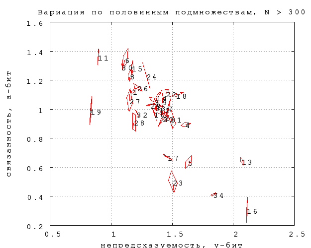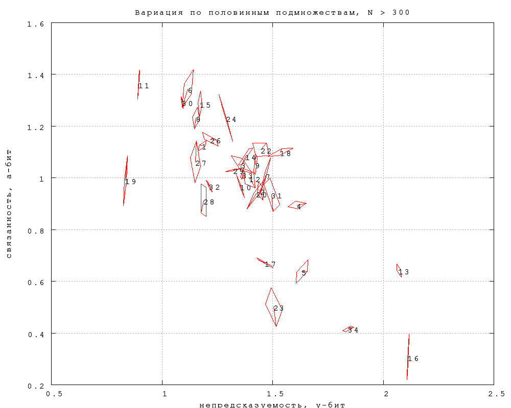 83) Любопытно (но не очень достоверно статистически), что вся разница между непредсказуемостью трех изучавшихся прозаических текстов оказывается за счет разной метрической непредсказуемости -- неметрическая часть у них одинаковая. Мы будем пользоваться сходными методами и в дальнейшем, изучая другие отдельные аспекты выбора слов.Фиг. 30