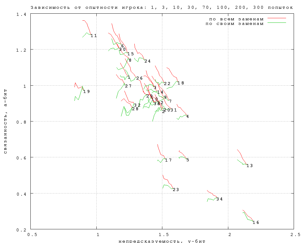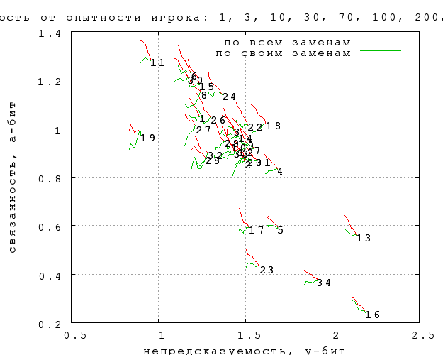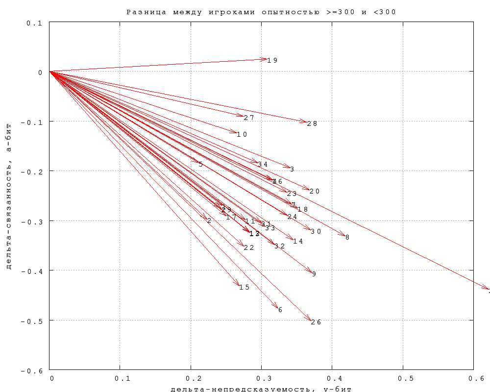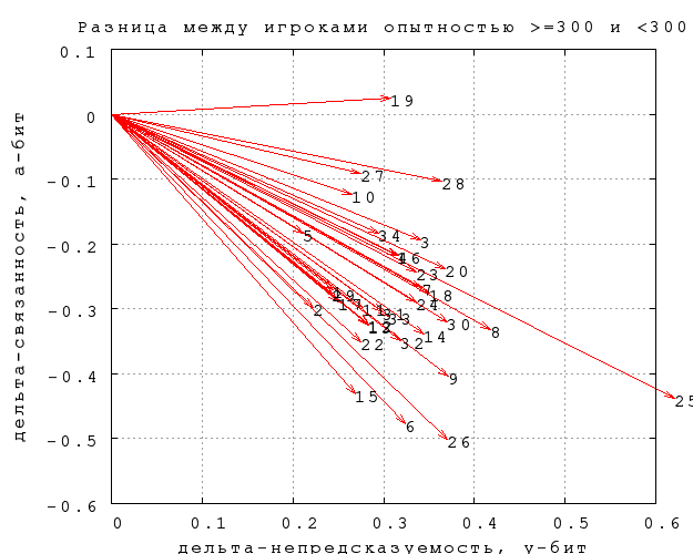 На фиг. 4 показана разница между данными по игрокам с опытностью меньше и больше 300. Стрелки указывают, как меняются непредсказуемость и связанность при переходе от первых ко вторым.