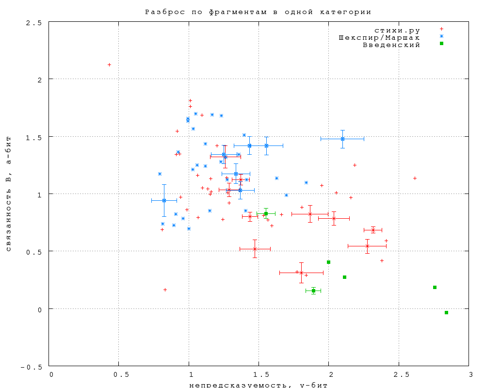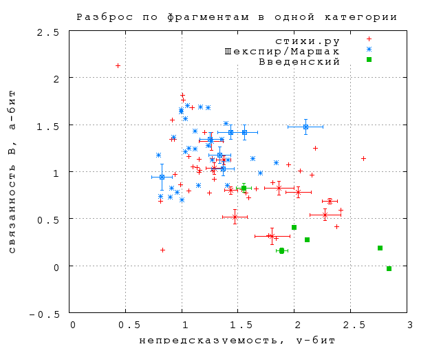 Насколько оправданно объединение текстов в категории? На фиг. 26 показаны данные по отдельным текстам в трех категориях -- самой однородной (Шекспир/Маршак), самой неоднородной (стихи.ру) и промежуточной (Введенский). Теоретическая оценка статистической погрешности показана только для некоторых точек, чтобы не загромождать график.Прежде всего прочего этот график показывае, что статистика еще далеко не достаточная для выводов по отдельным текстам (не говоря уже об отдельных фрагментах). Тем не менее, можно уже, по-видимому, говорить о том, что разброс точек значимо меньше у однородных категорий. Интересно, что в обоих случаях облако точек имеет отчетливо вытянутую форму, но от интерпретаций тут пока следует воздержаться.