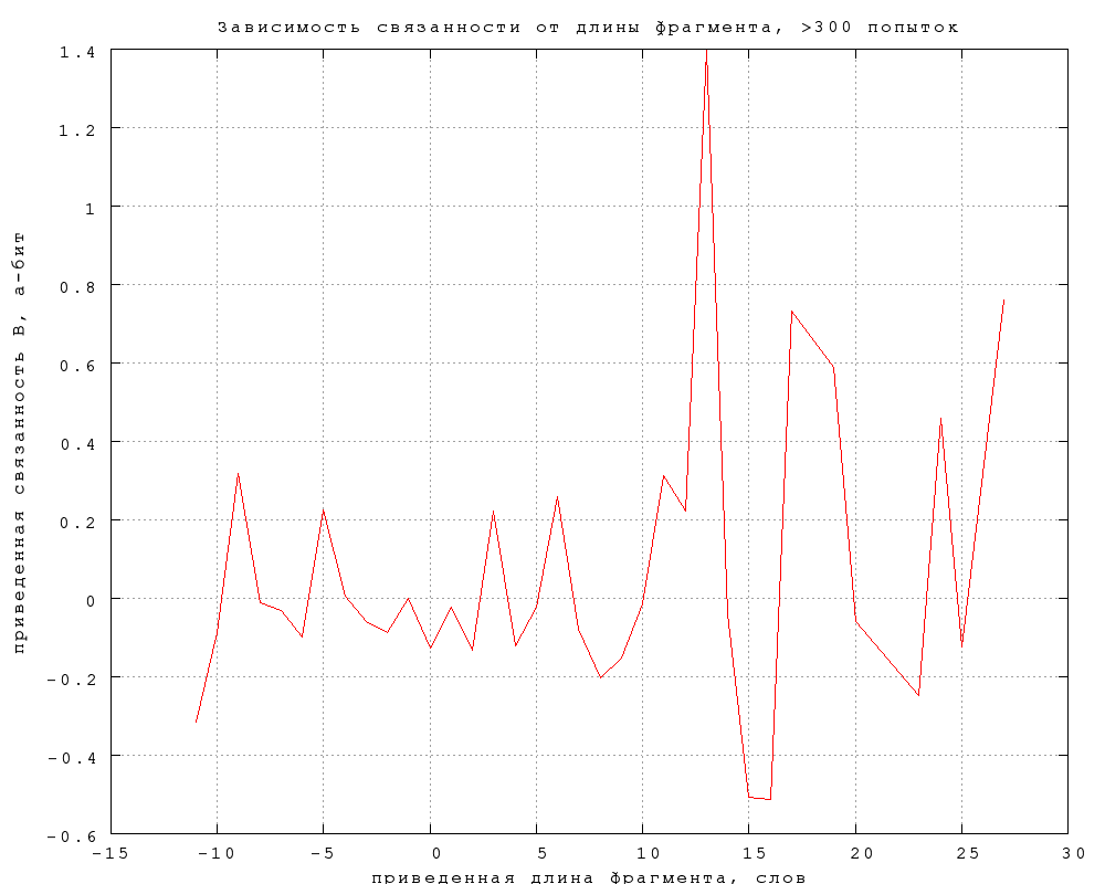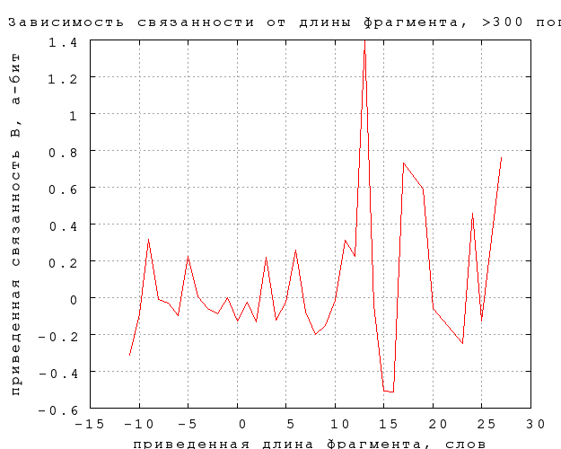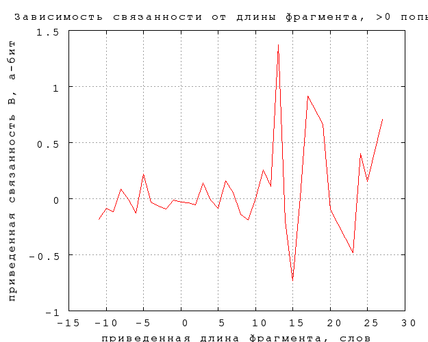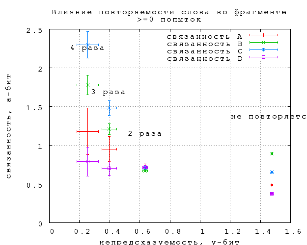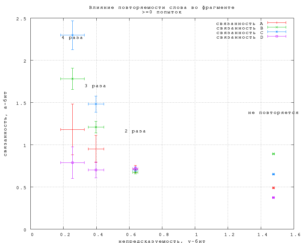 Повторяющиеся внутри фрагмента слова угадываются, очевидно, легче. Менее очевидно, что на связанность любого типа повторение слова влияния не оказывает. Согласно фиг. 27, различия в связанности повторяющихся и неповторяюшихся слов не выходят за пределы статистической погрешности, за исключением, может быть, троекратного повторения ("То, что трижды сказал, то и есть" -- из "Охоты не Снарка" в переводе Г. Кружкова). Заметим, что такое же отличие в поведении непредсказуемости и связанности мы наблюдали по отношению к длине слова.Фиг. 27