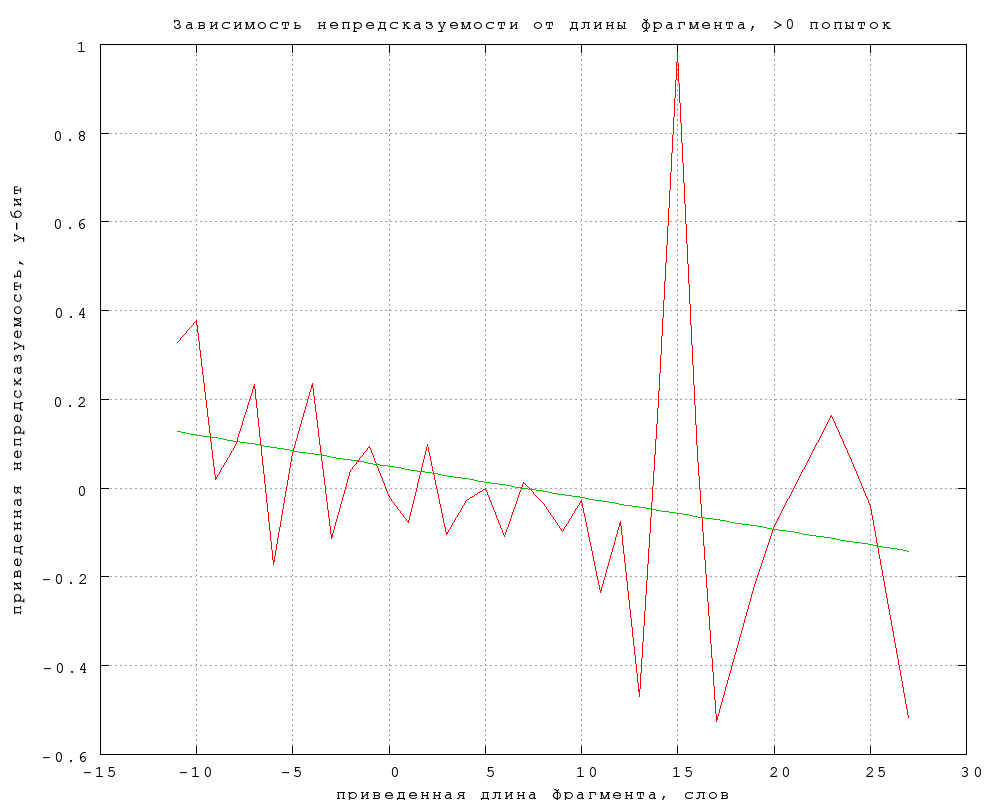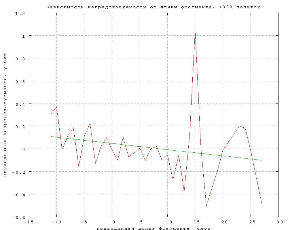 Угадываемость слова, вообще говоря, может зависеть от длины фрагмента -- например, потому что в более длинном фрагменте больше перекрестных отношений между словами, связей, подсказок. Поэтому разница между категориями может, по крайней мере отчасти, проистекать от того, что в некоторых категориях фрагменты в среднем длиннее, чем в других. Фиг. 8-12 показывают, что этот эффект пренебрежимо мал. На них изображены зависимости предсказуемости и связанности B от длины фрагмента в словах. Чтобы выделить зависимость от длины фрагмента в чистом виде, данные обрабатывались следующим образом:Зеленые прямые -- наилучшее линейное приближение. Во всех случаях их наклон оказывается пренебрежимо мал и статистически незначим. Таким образом, разницу в средней длине фрагмента можно не учитывать при обработке результатов. Фиг. 8