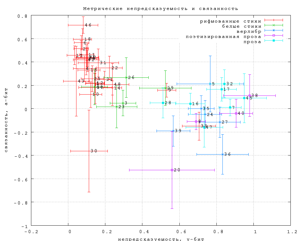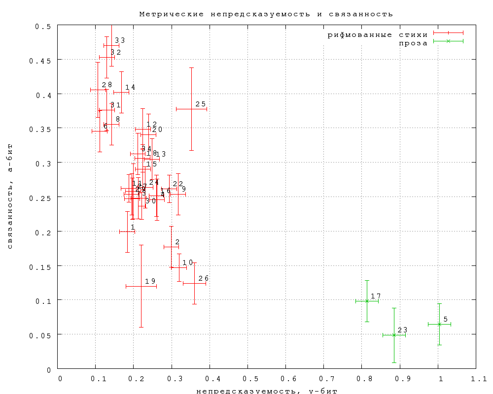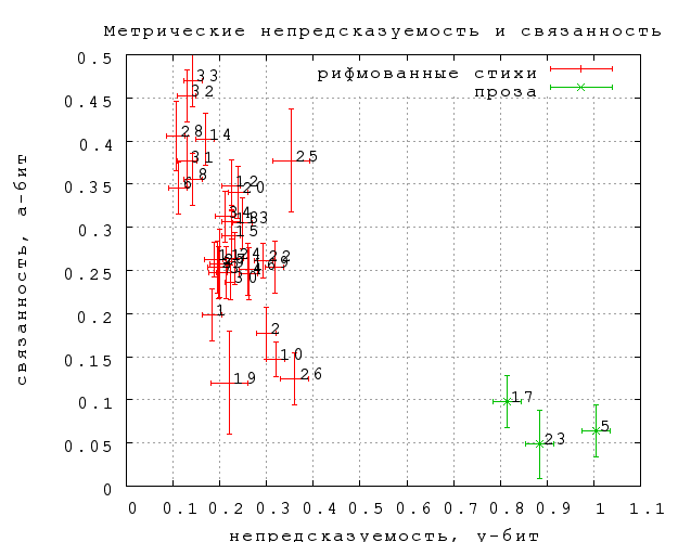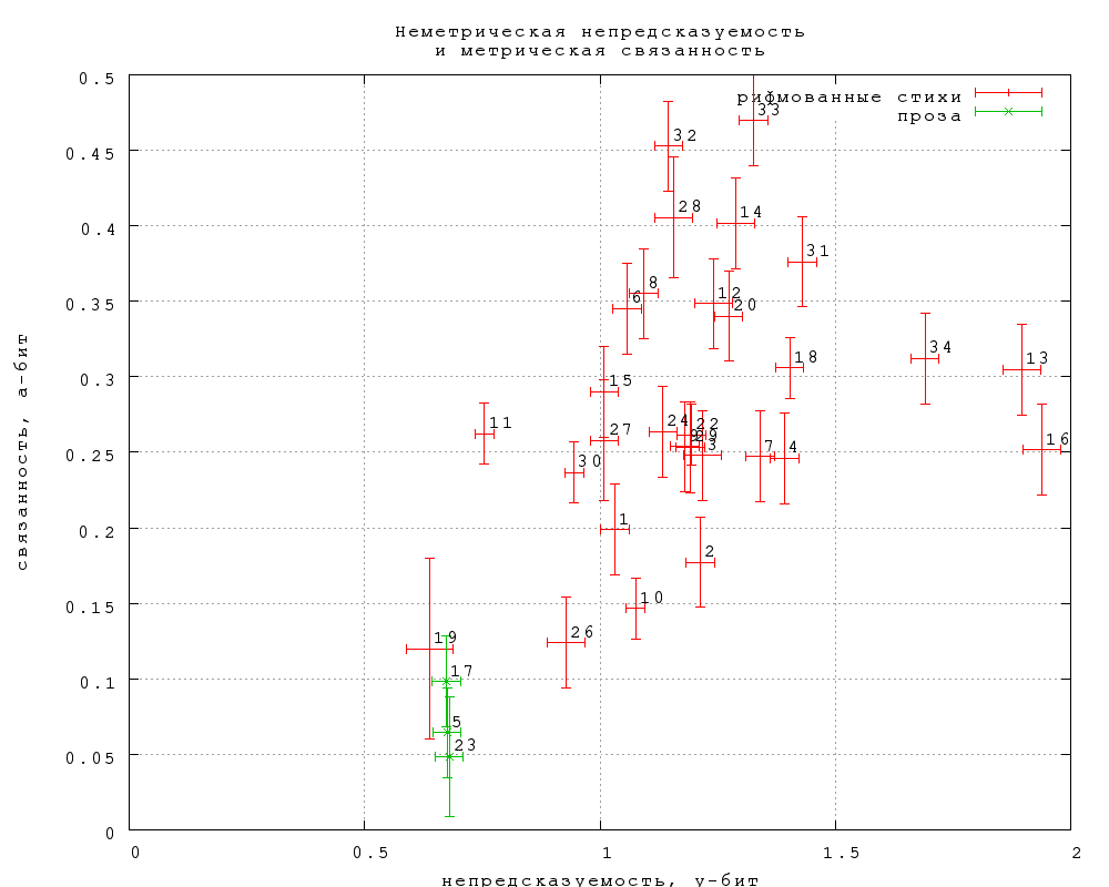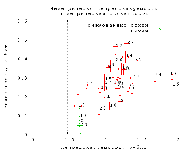 Представляет интерес еще одна величина, которую мы обозначим как "неметрическую непредсказуемость" за отсутствием менее уродливого термина. Это просто разность между полной и метрической непредсказуемостью. Она характеризует вероятность угадать слово при условии, что его слоговая длина известна (уже угадана). Она, таким образов как бы снимает преимущество в непредсказуемости, которое имеет проза по сравнению со стихом за счет метра. Результаты представлены на фиг. 30. Оказывается, что с метрической подсказкой непредсказуемость прозы становится меньше, чем у любых стихов (и на уровне "тостов и поздравлений").
