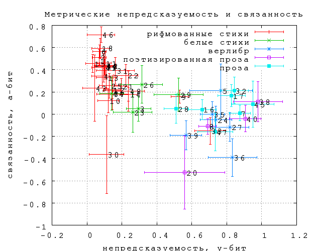 Фиг. 28 показывает распределение этих двух величин для первого этапа. Для прозы метрическая непредсказуемость значительно выше, чем для стихов, преимущественно силлаботонических рифмованных в этом этапе. Метрическая связанность прозы близка к нулю, но значимо выше у стихов. Эта картина вполне согласуется с интуицией. Самая высокая метрическая связанность у поэзии XVIII века и переводов Шекспира (а также почему-то у Ахмадулиной). Самая низкая -- у любительских стихов ("тосты и поздравления", стихи.ру, "Самиздат"), а также у текстов песен Щербакова, которые часто полиметричны. Отдельно стоящая точка 25 -- это "Шитверочестия" С.Шпикуна.