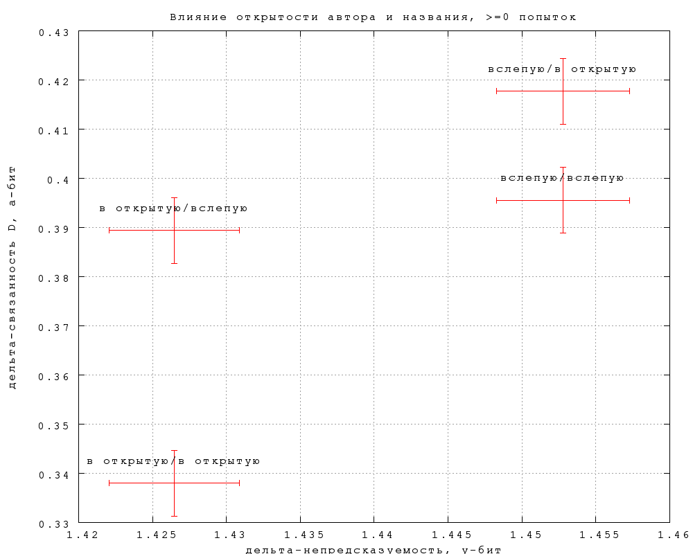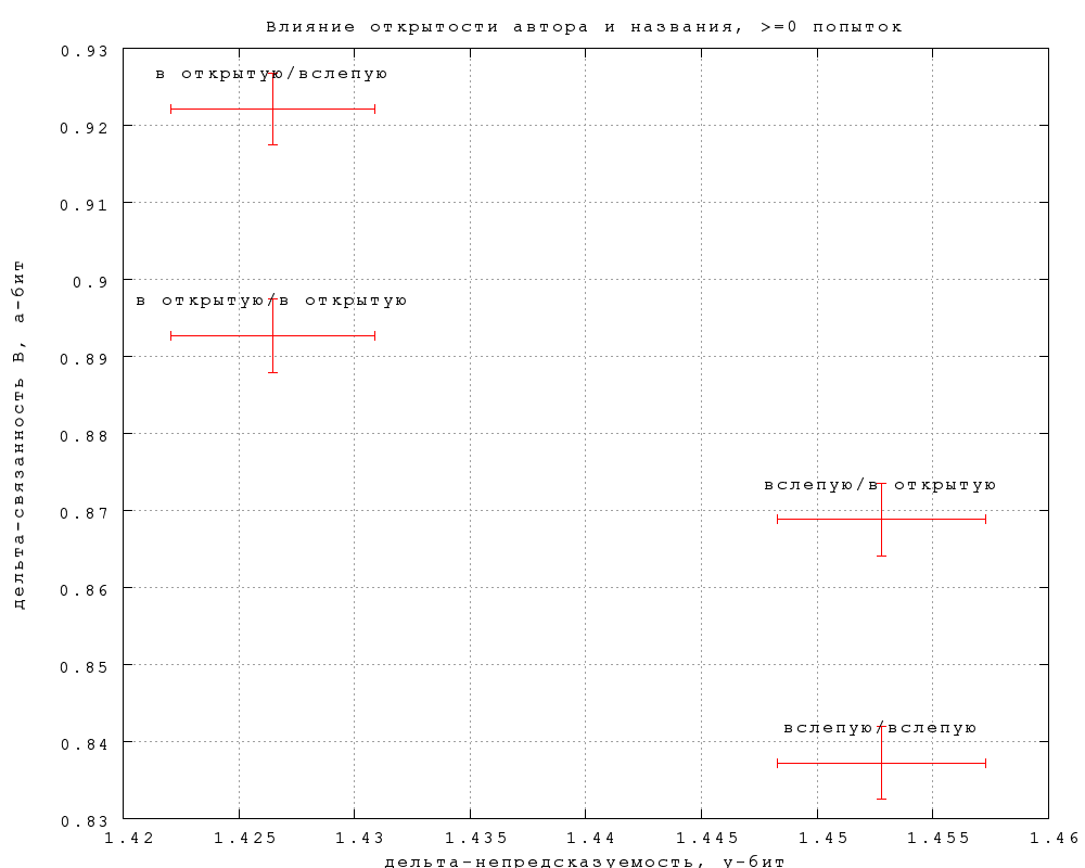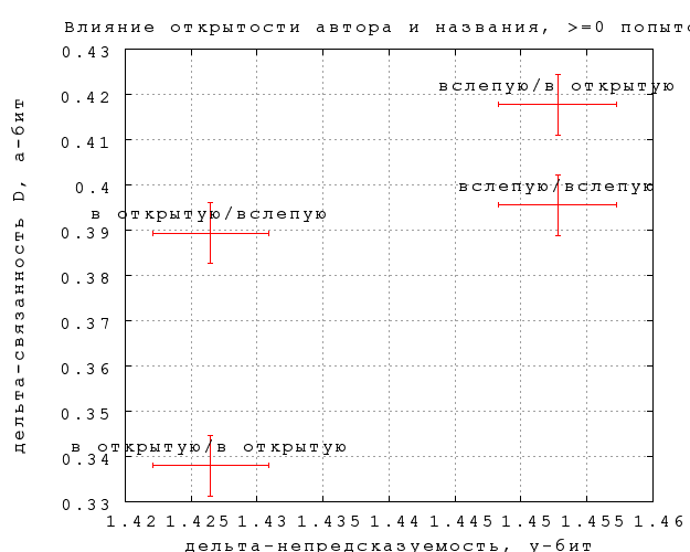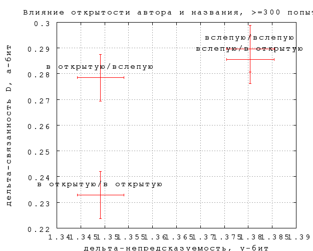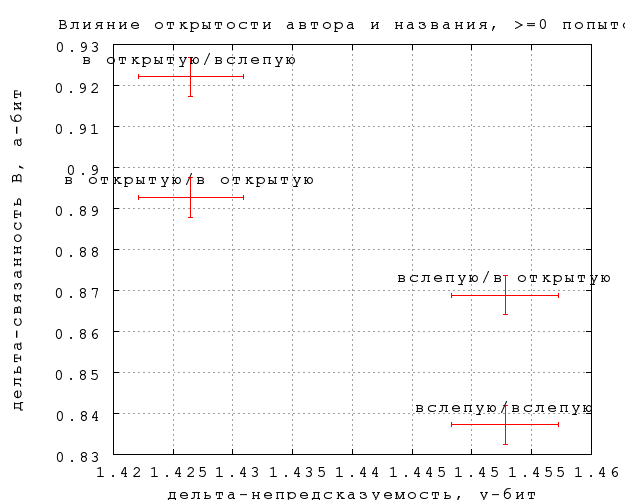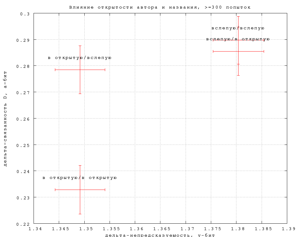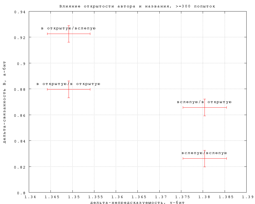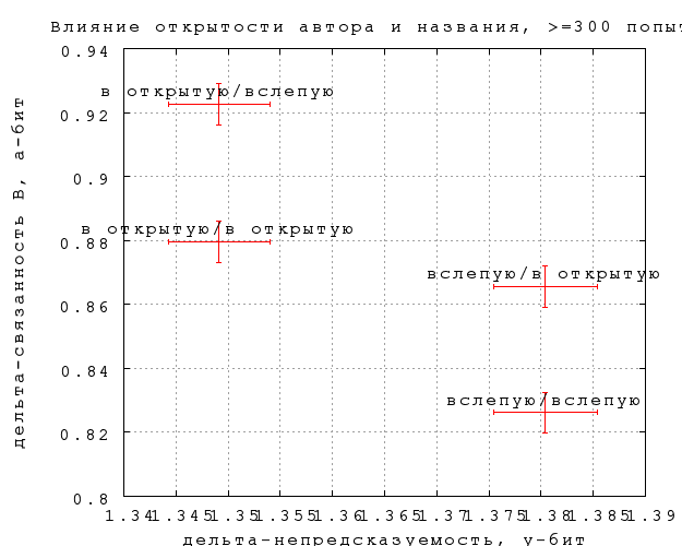 На фиг. 12-15 показано, как влияет на результаты предъявление игроку автора и названия фрагмента. На каждом графике нанесены 4 точки, в соответствии с тем, видел ли автора и название угадывавший игрок и игрок, предложивший замену (если в попытке участвовала замена). Так, пометка "вслепую/в открытую" означает, что угадывавшему не показывалось, а автору замены показывалось. Приведены данные по всем игрокам и по игрокам с опытностью 300, по связанности B и связанности D.Различия существуют, но находятся на грани статистической значимости, особенно по связанности. Тот факт, что непредсказуемость слегка выше, по слепым попыткам, неудивителен, замечательно скорее, что эффект очень невелик. Влияние на предсказуемость еще слабее и противоречиво, что может объясняться чисто случайными причинами. По крайней мере, данных пока недостаточно, чтобы утверждать, что замены, сделанные вслепую, получаются убедительнее сделанных в открытую.
