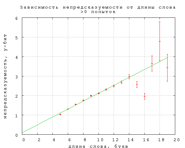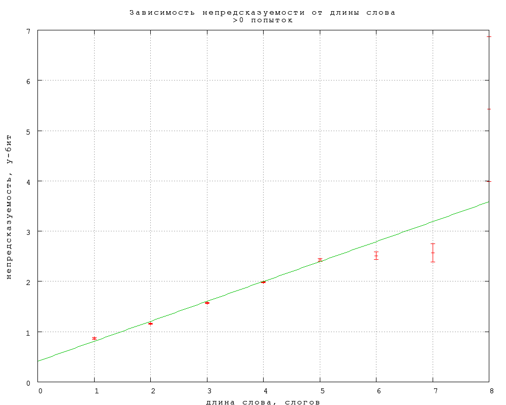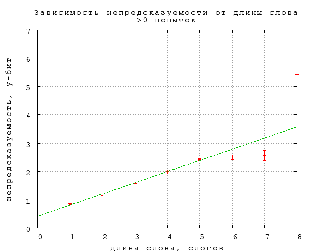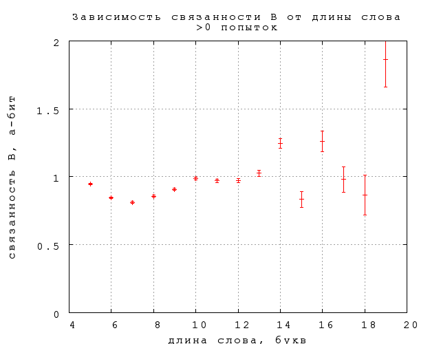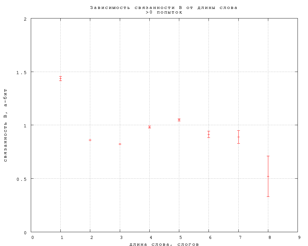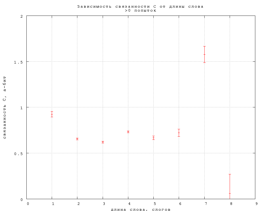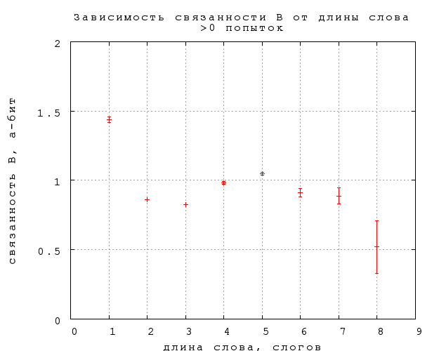 Зависимость непредсказуемости и связанности B и C от длины слова, выраженной в буквах и слогах, приведена на фиг. 16-21. Примечателен линейный рост непредсказуемости, в полном согласии со стандартной теорией информации, в предположении о статистической независимости букв в слове. Буквально оно не справедливо, конечно, но этот линейный рост показывает, что количество (равноправных) вариантов, которое мы рассматриваем, угадывая слово, растет экспоненциально с увеличением длины слова.84) При этом наклон прямой дает информативность в 0,2 бит на букву (строго говоря, каждую следующую букву после 4-й) и 0,44 бит на слог, что приблизительно согласуется со средней длиной слога в две с небольшим буквы. Конечно, это много (в 225, т.е. 30 миллионов раз по количеству рассматриваемых вариантов) меньше 5 бит на букву для случайных наборов букв. Отметим также, что рост непредсказуемости резко насыщается для слов длиннее 4 слогов. Любопытно в будущем посмотреть, как отличаются эти результаты для прозы и стихов.Связанность же оказывается в первом приближении не зависящей от длины слова, если не считать небольшого понижения на словах средней длины, 6-7 букв или 2-3 слога. Такая принципиальная разница между связанностью и предсказуемостью требует объяснения. Возможно, она связана просто с тем, что в заданиях 2-го и 3-го типа мы выбираем из двух вариантов ответа, независимо от длины слова, но могут быть и более содержательные объяснения.
