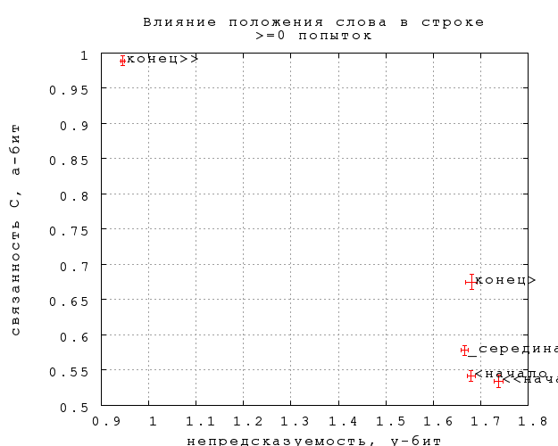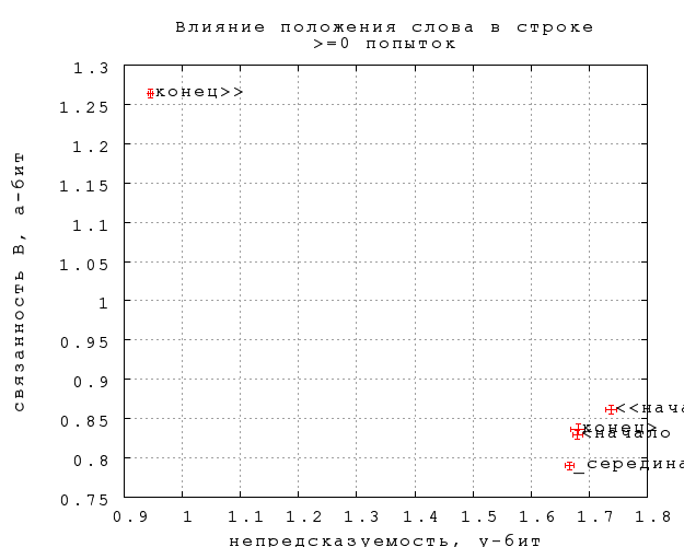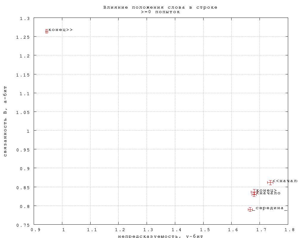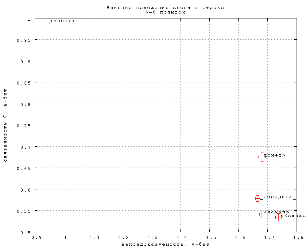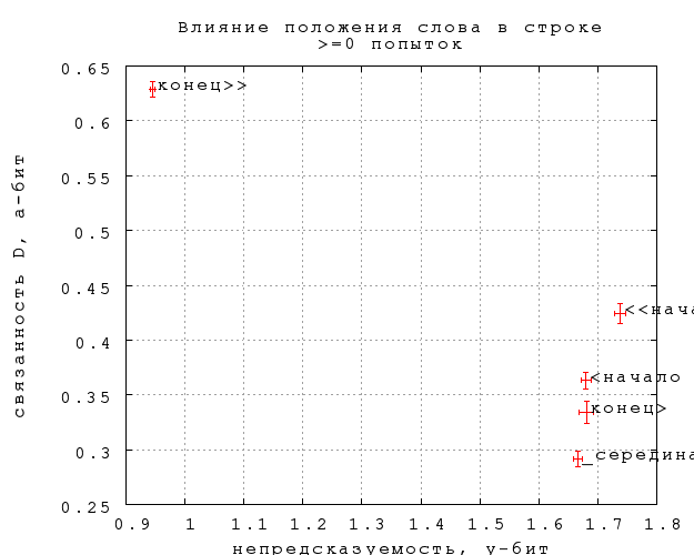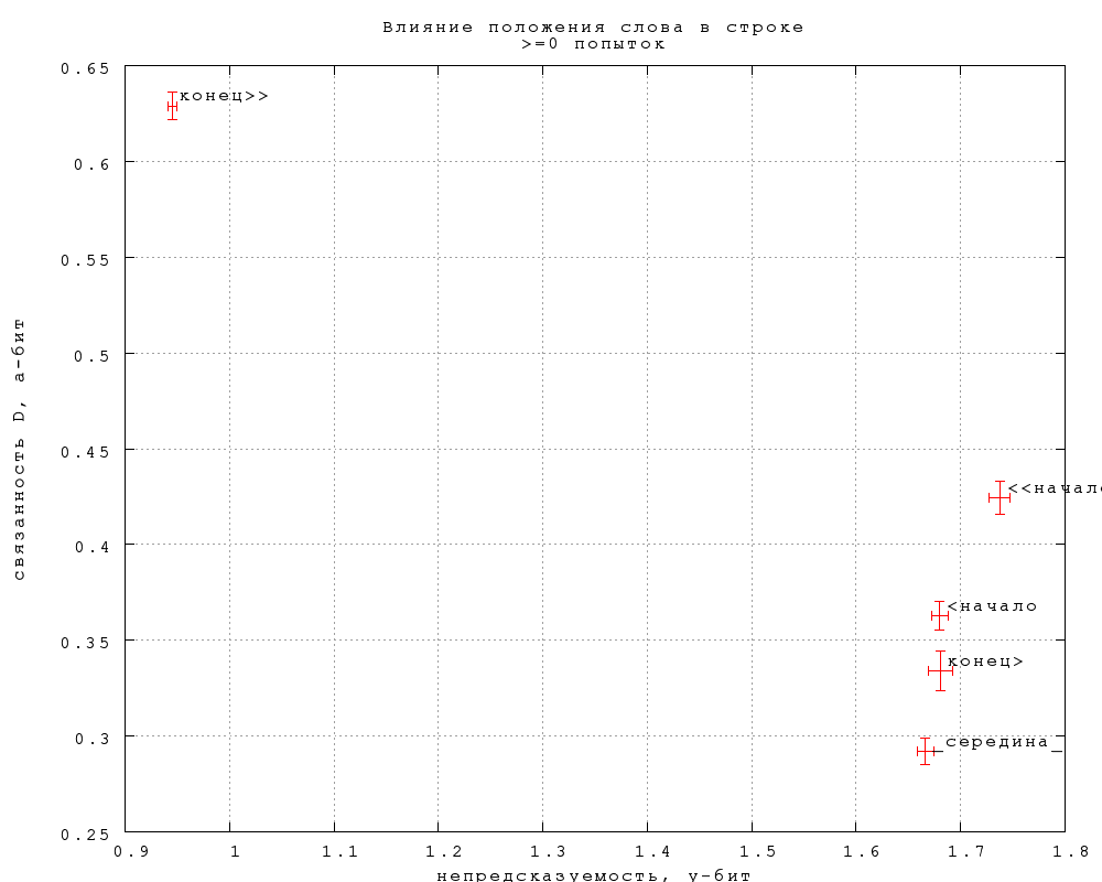Видно, что строгие концы разительно отличаются от всех остальных позиций, как и следовало ожидать (в меньшей степени по связанности D). Из остальных позиций строгие начала несильно, но значимо непредсказуемее. Три серединные позиции практически не отличаются по предсказуемости, а отличия по связанности если и есть, то недостаточно выражены, чтобы приобрести статистическую значимость при нынешнем числе попыток (полмиллиона).