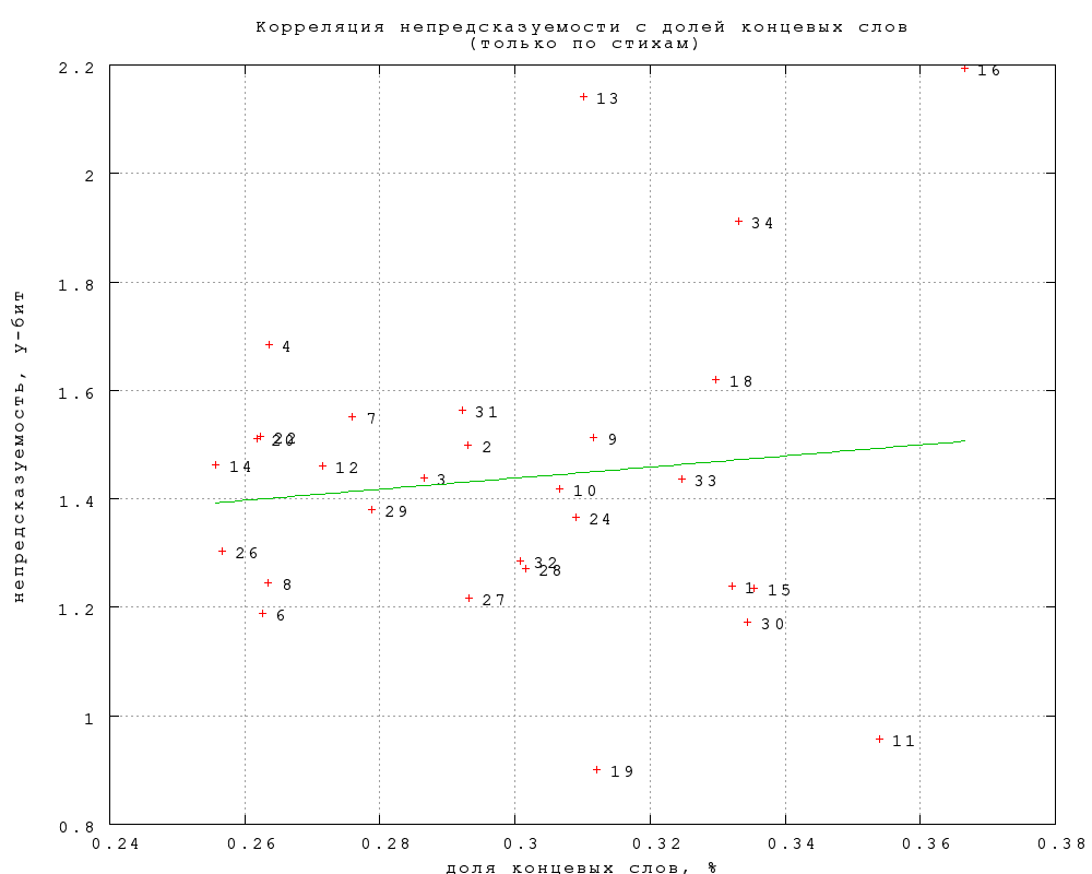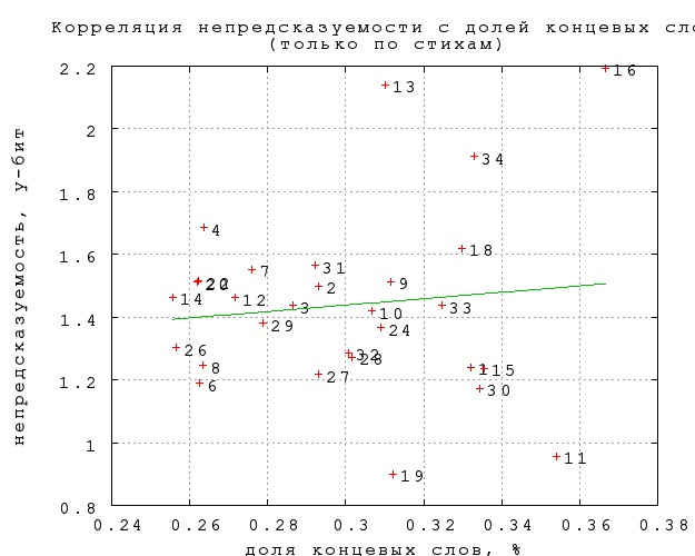 Учитывая, что между категориями имеются систематические различия в длине строк, а следовательно, и в доле слов в концевой позиции, следует проверить, не объясняются ли, хотя бы частично, различия между категориями этим фактором. Фиг. 25 показывает, что корреляция между долей концевых слов и непредсказуемостью в категории отсутствует. Показательно, что среди категорий с особенно короткими строками есть как самые предсказуемые, так и самые непредсказуемые. Этот вывод не меняется от того, учитывать ли только строго концевые позиции, или вместе с нестрогими. Таким образом, мы снова убеждаемся, что различия между категориями не объясняются "внешними" факторами.