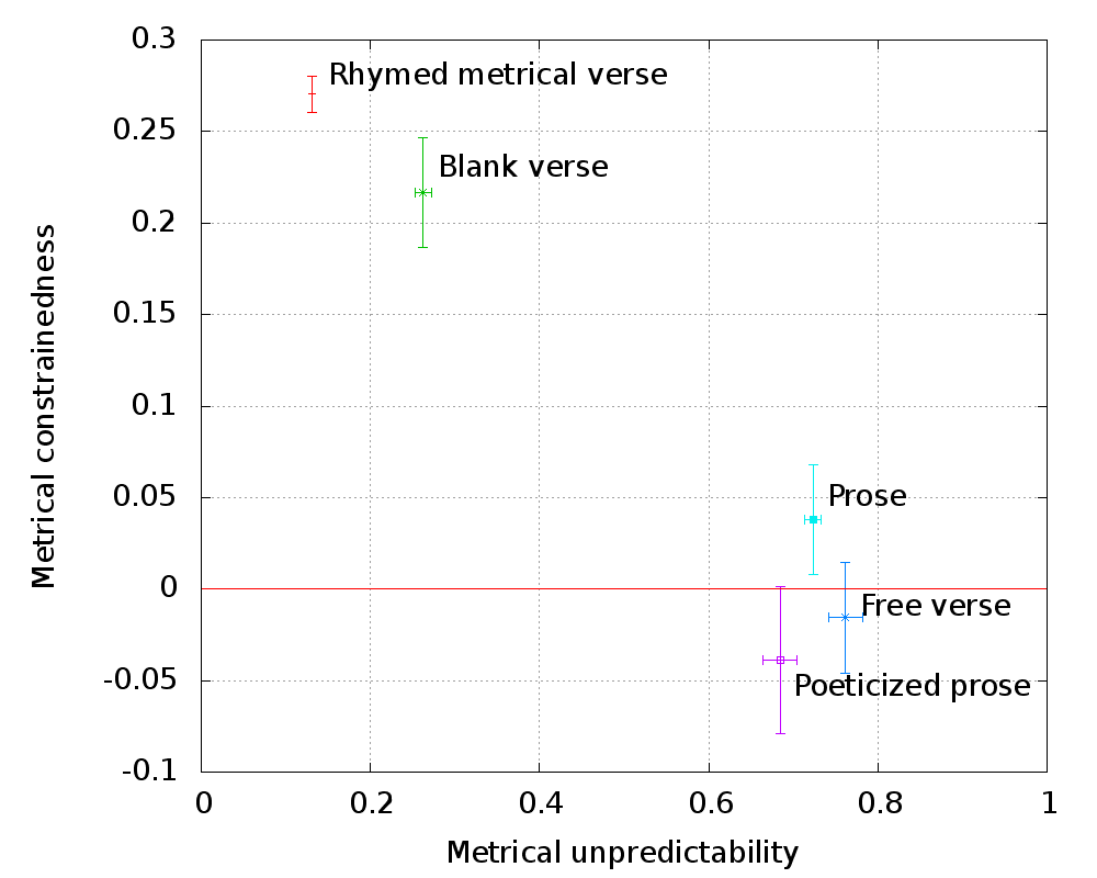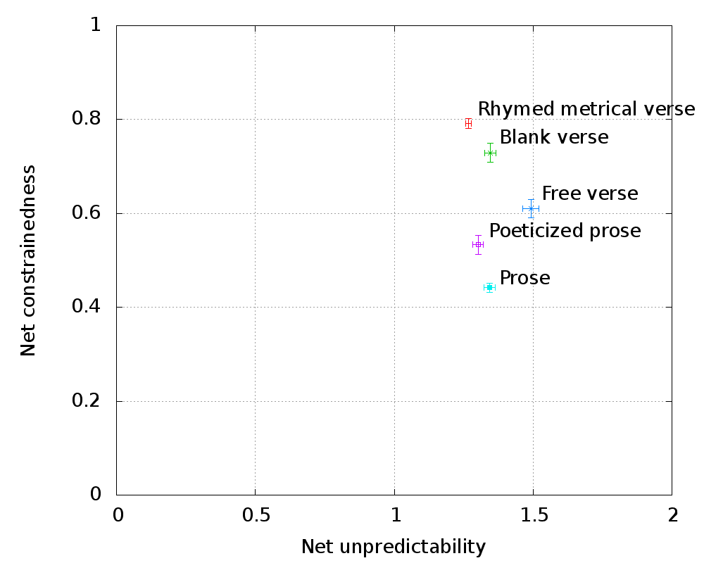 Конечно, граница между стихами и прозой размыта, однако существует и множество текстов, природа которых не вызывает сомнений. Поэтому сначала мы посмотрим, как отличаются друг от друга такие архетипические проза и поэзия в терминах непредсказуемости и связанности, а затем опишем положение верлибра относительно этих опорных точек.